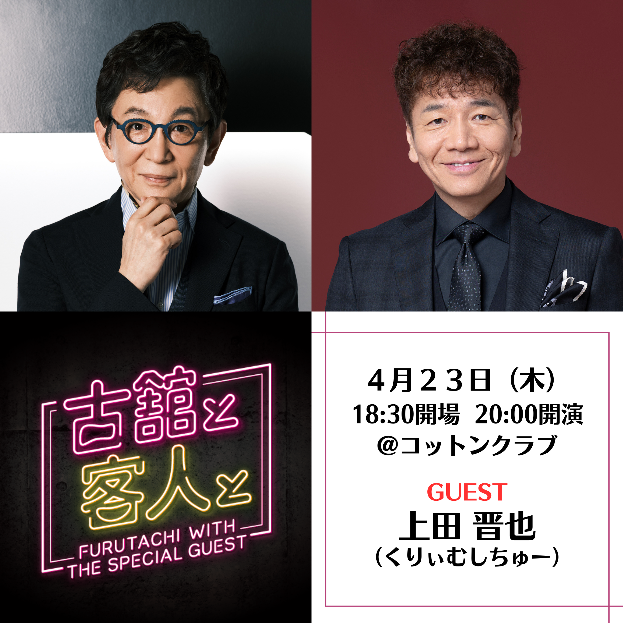 マイク一本で一人語りをする“トーキングブルース”など、「喋り屋」として確固たるポジションを築いてきた古舘伊知郎。2023年6月に新宿でスタートしたトークライヴ「古舘と客人と」が場所を移し、丸の内コットンクラブでの開催は24回目となる。今回は、歌手・タレントのミッツ・マングローブを迎えて、大いに語り合う。台本なし、演出なし、いわばオーディエンスの前でのプライベートトーク。古舘伊知郎がいま話したい人をゲストに迎え、サシで語り合う、その日・その時限りのプレミアムな雑談を、ぜひご一緒に!